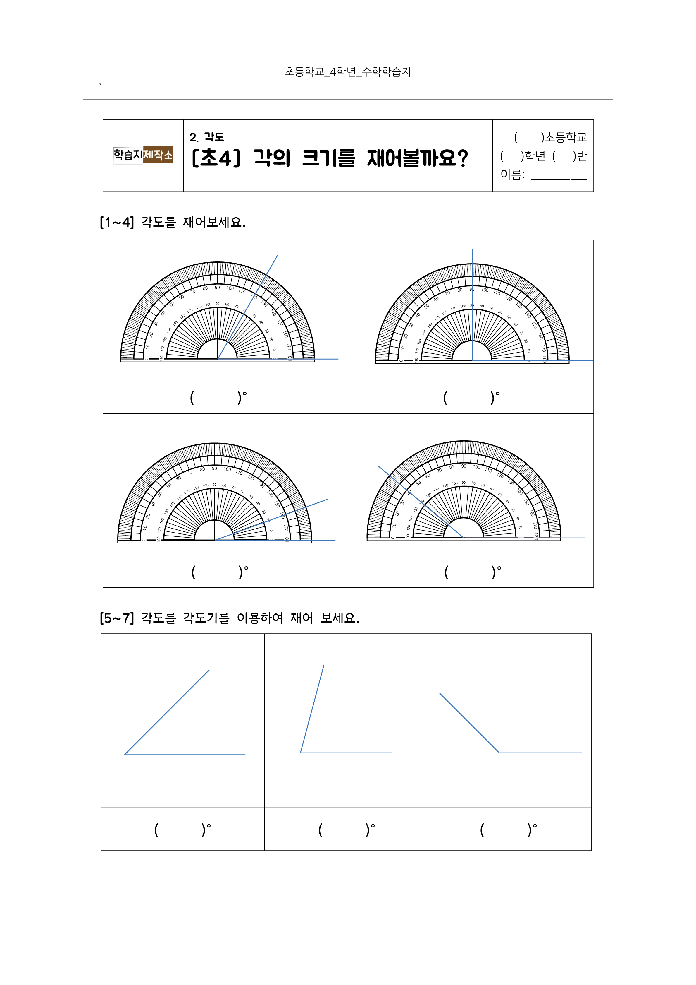 #태그 : 초4, 초등학교 4학년, 각도, 각의 크기 측정하기, 각도기 사용법, 각도기 쓰는 방법, 각의 크기 재는 법, 각도 활동지, 각도 수학문제, 학습지제작소