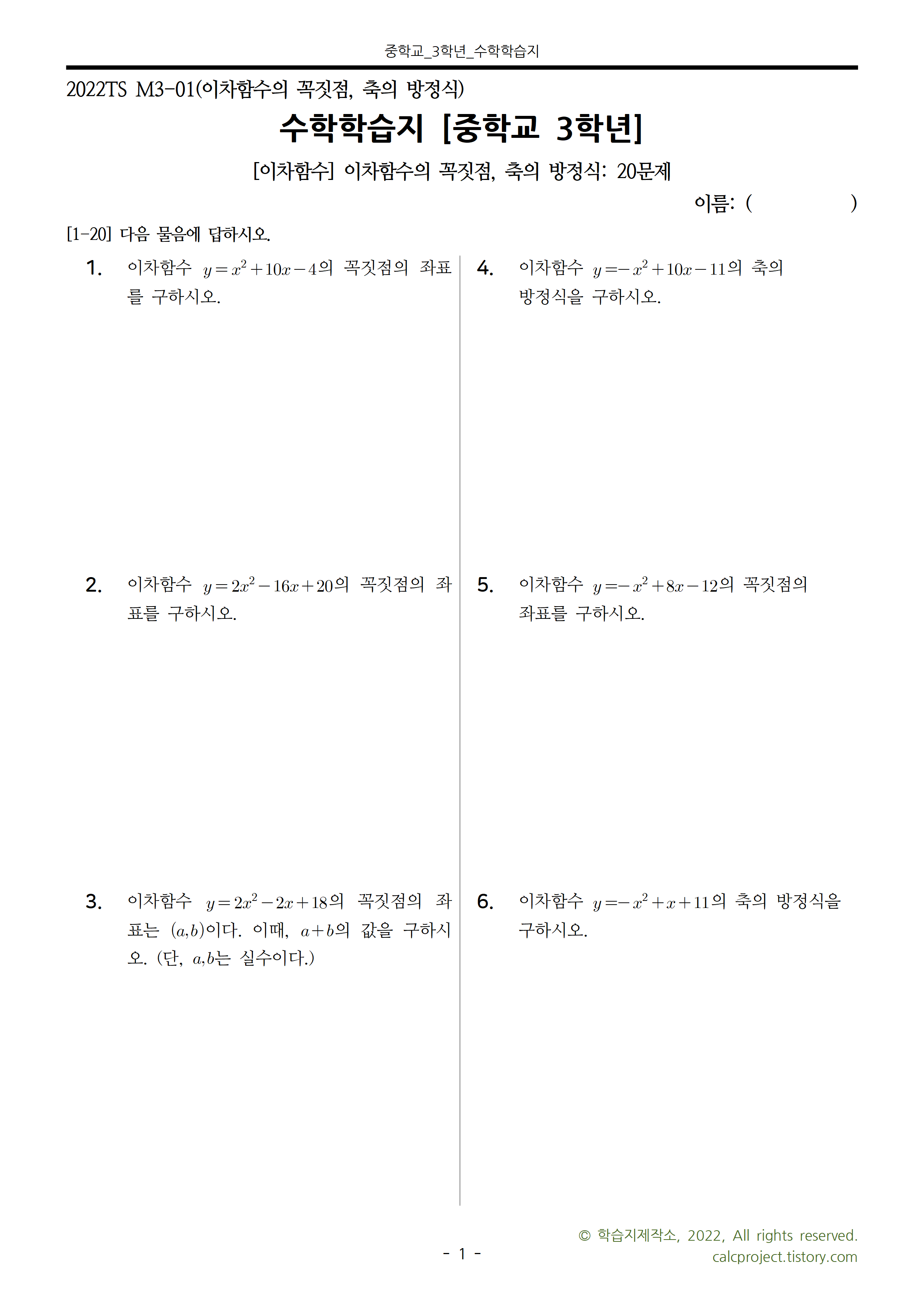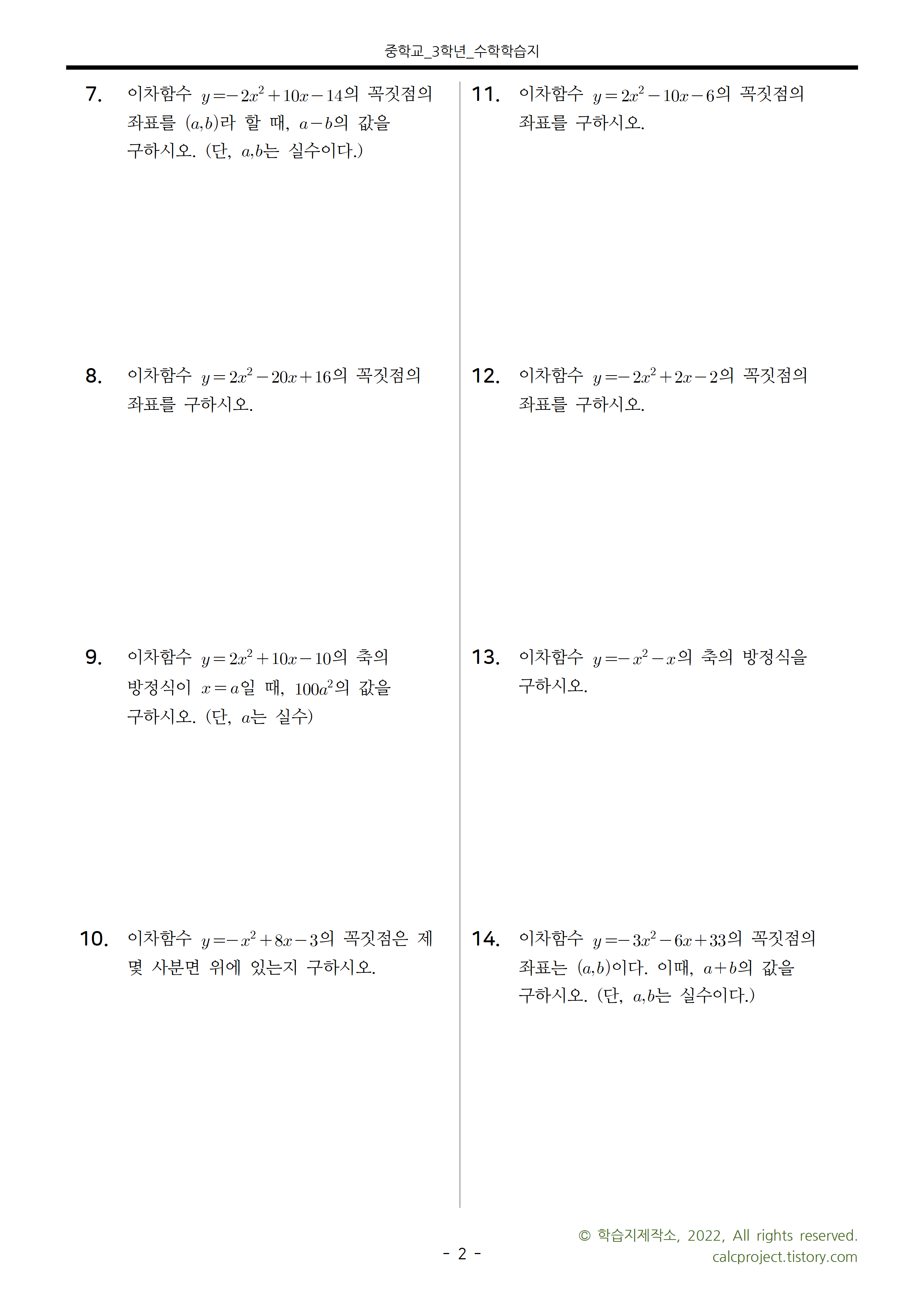 #태그 : 중3, 중학교 3학년, 이차함수 문제, 이차함수 꼭짓점, 이차함수 축의 방정식, 중3 수학, 중학교 이차함수 학습지, 수학학습지, 학습지제작소