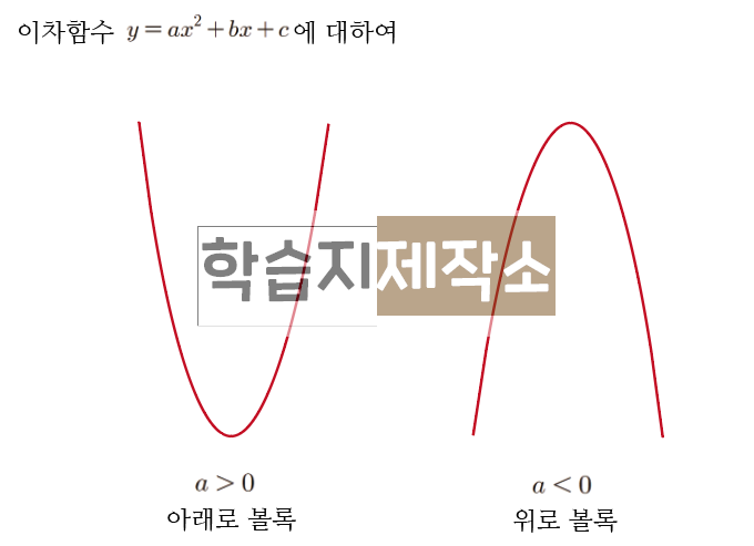 에 대하여 a>0이면 아래로 볼록, a<0이면 위로 볼록한 모양이 됩니다.