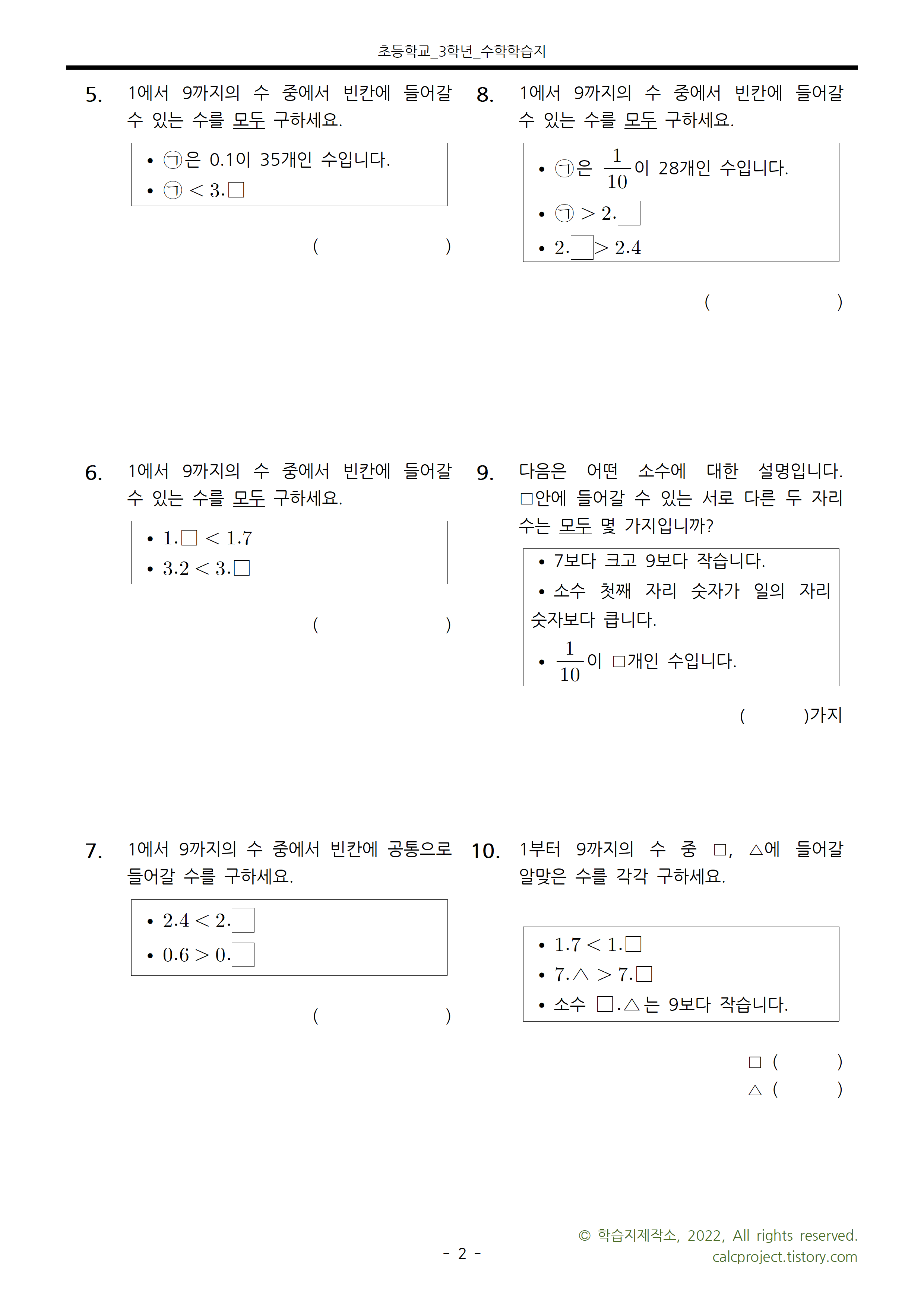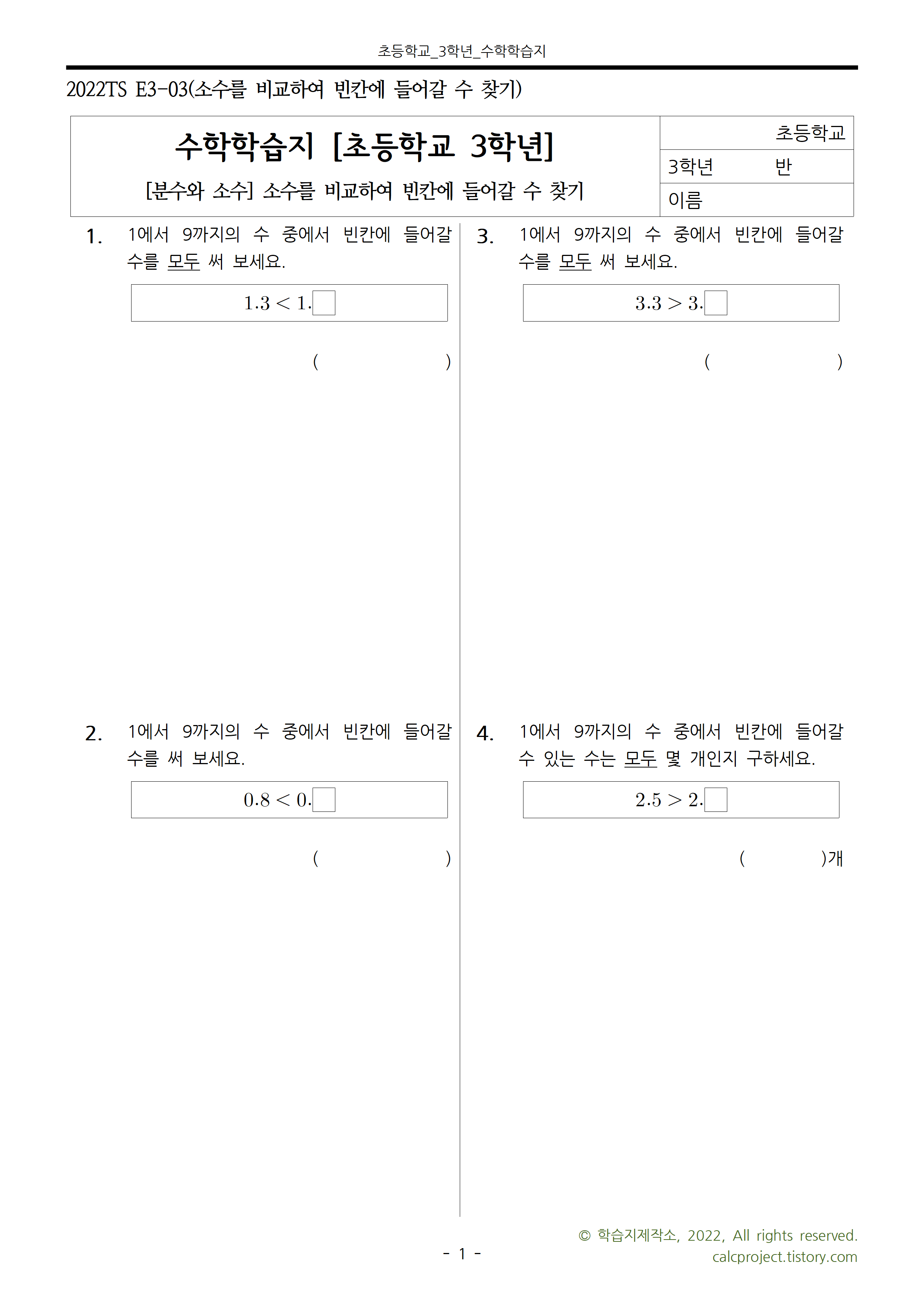 #태그 : 초3, 초등학교 3학년, 분수와 소수, 소수의 크기 비교하기, 빈칸에 들어갈 수 구하기