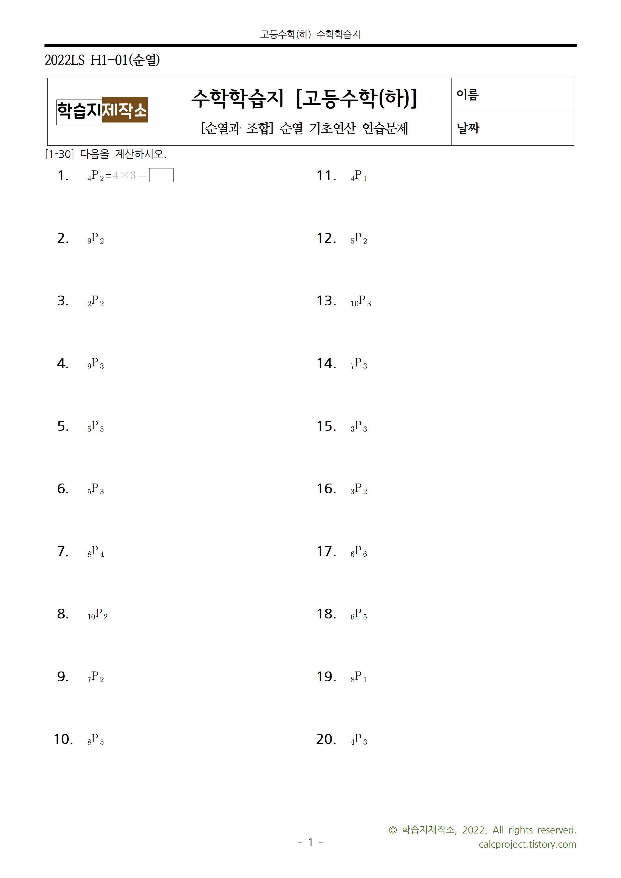 이번 학습지는 순열을 주제로 한 기초 연습문제입니다. 총 34문제로, $_{n} P _{a}$의 값을 구하는 연산문제와 적용형 문제로 구성되어 있습니다.