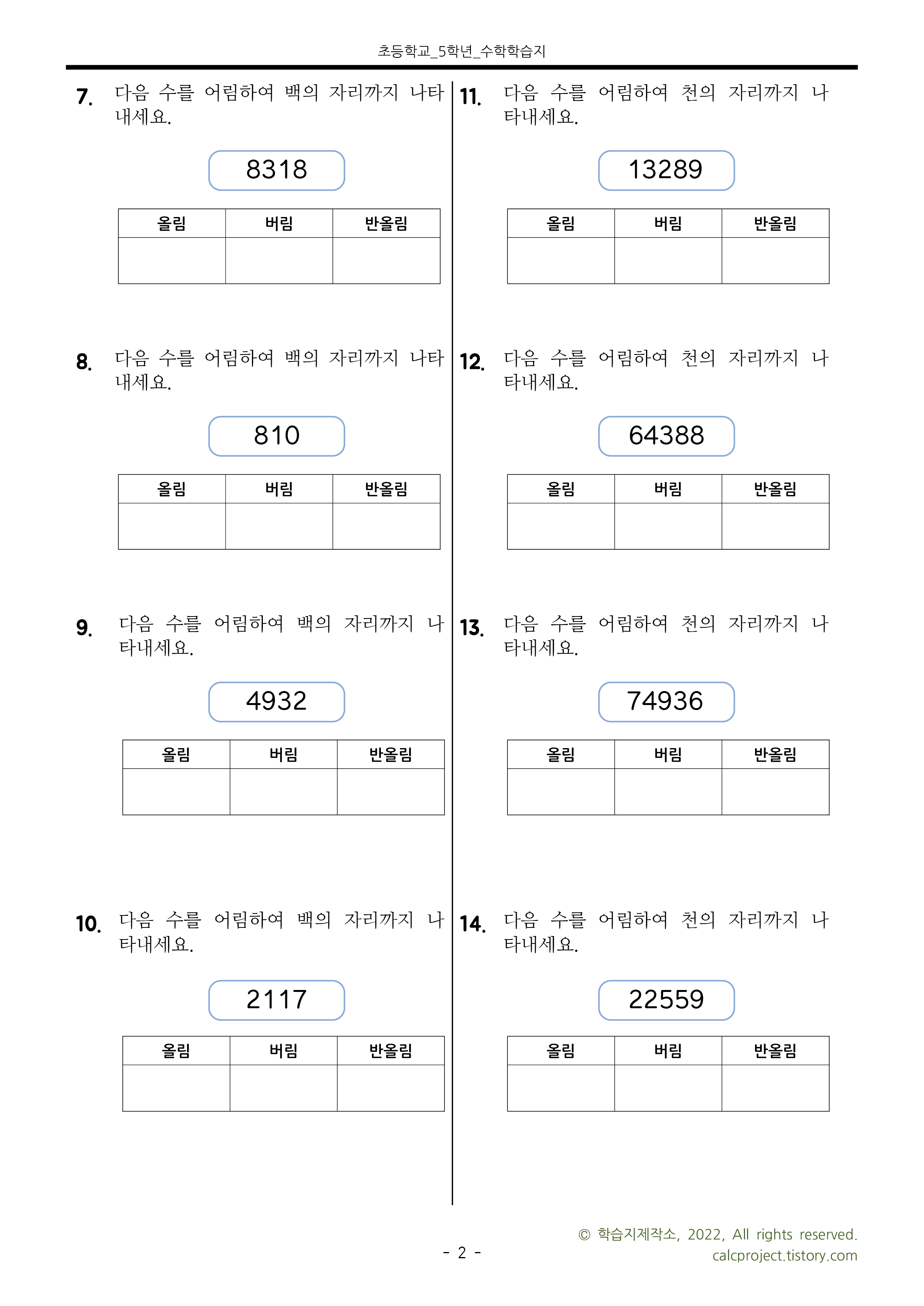 이번 학습지는 하나의 수를 올림, 버림, 반올림하여 어림하는 문제들로 구성했습니다.