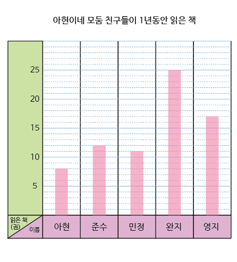 다음은 아현이네 모둠 친구들 5명의 읽은 책의 양을 비교하는 그래프입니다.