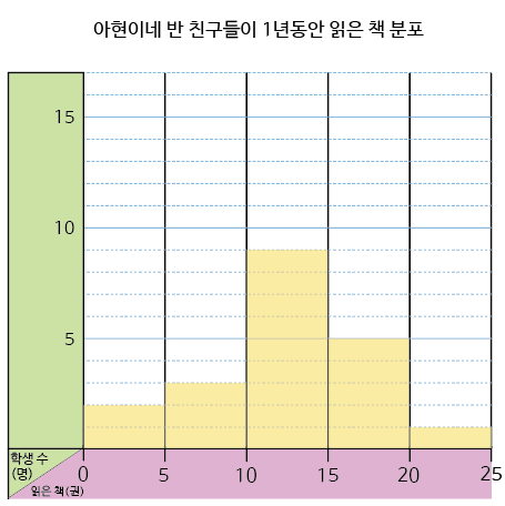 다음은 아현이네 반 친구들이 1년동안 읽은 책 분포입니다.
