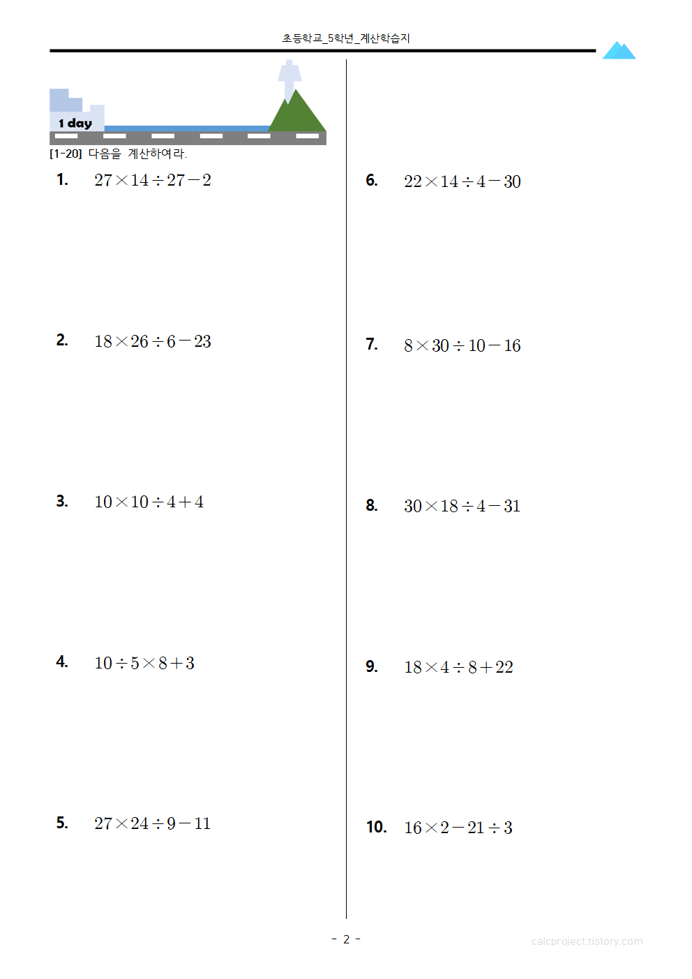 돌아가서, 오늘의 연산 문제는 괄호가 없는 덧셈, 뺄셈, 곱셈, 나눗셈의 혼합계산입니다.