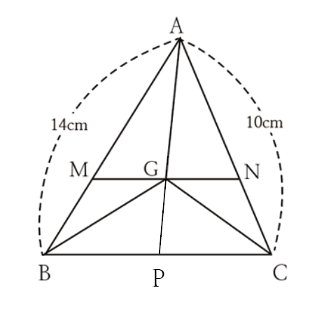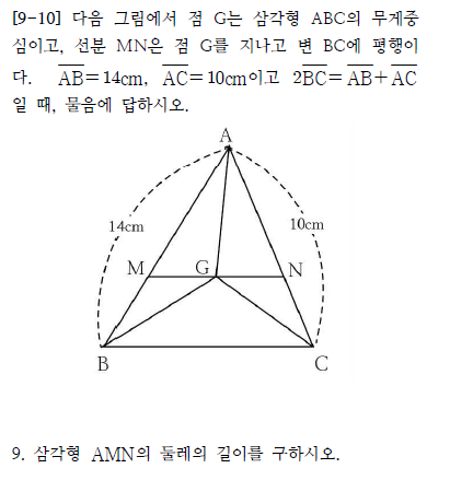 그림에서 선분 MN은 삼각형 ABC의 무게중심 G를 지나면서 변 BC와 평행합니다.