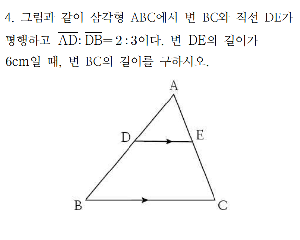 선분 DE의 길이가 6cm이므로 비례식을 세워봅시다.