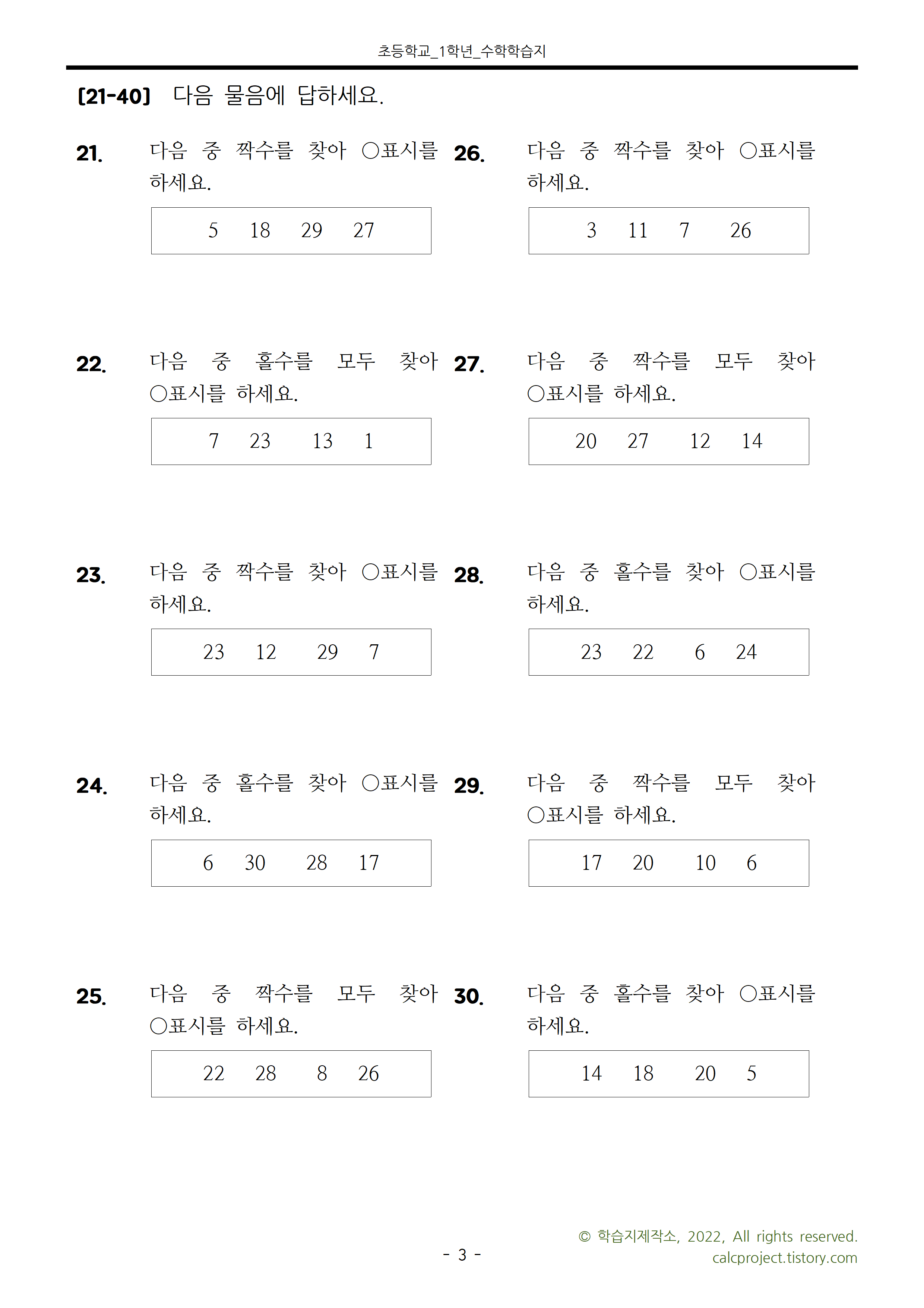 이번 학습지는 숫자가 홀수인지 짝수인지 알아보는 문제와 홀수/짝수를 고르는 문제로 구성했습니다.