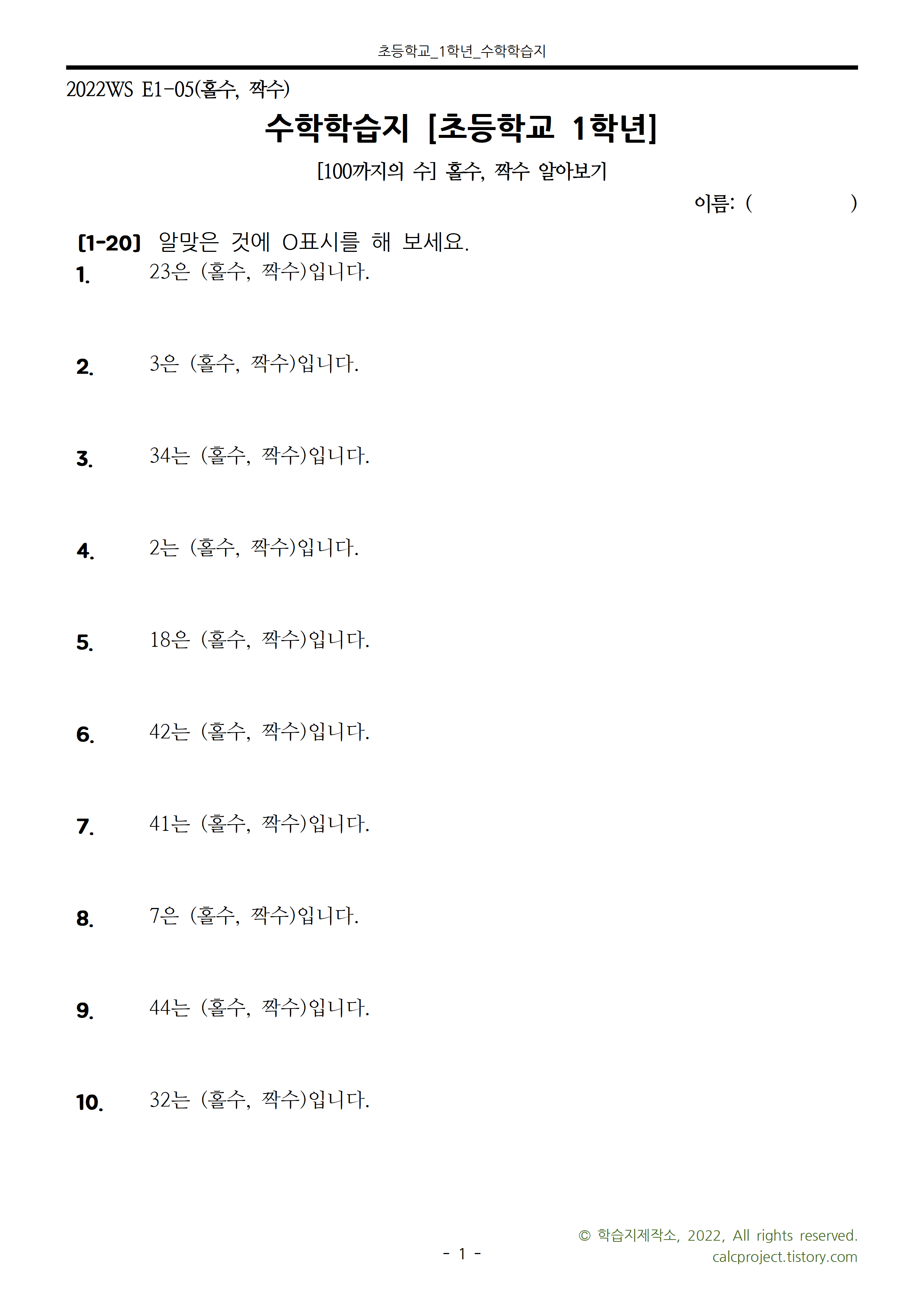 #태그 : 초1, 초등학교 1학년, 짝수 뜻, 홀수 뜻, 짝수 홀수 문제, 수학학습지, 학습지제작소