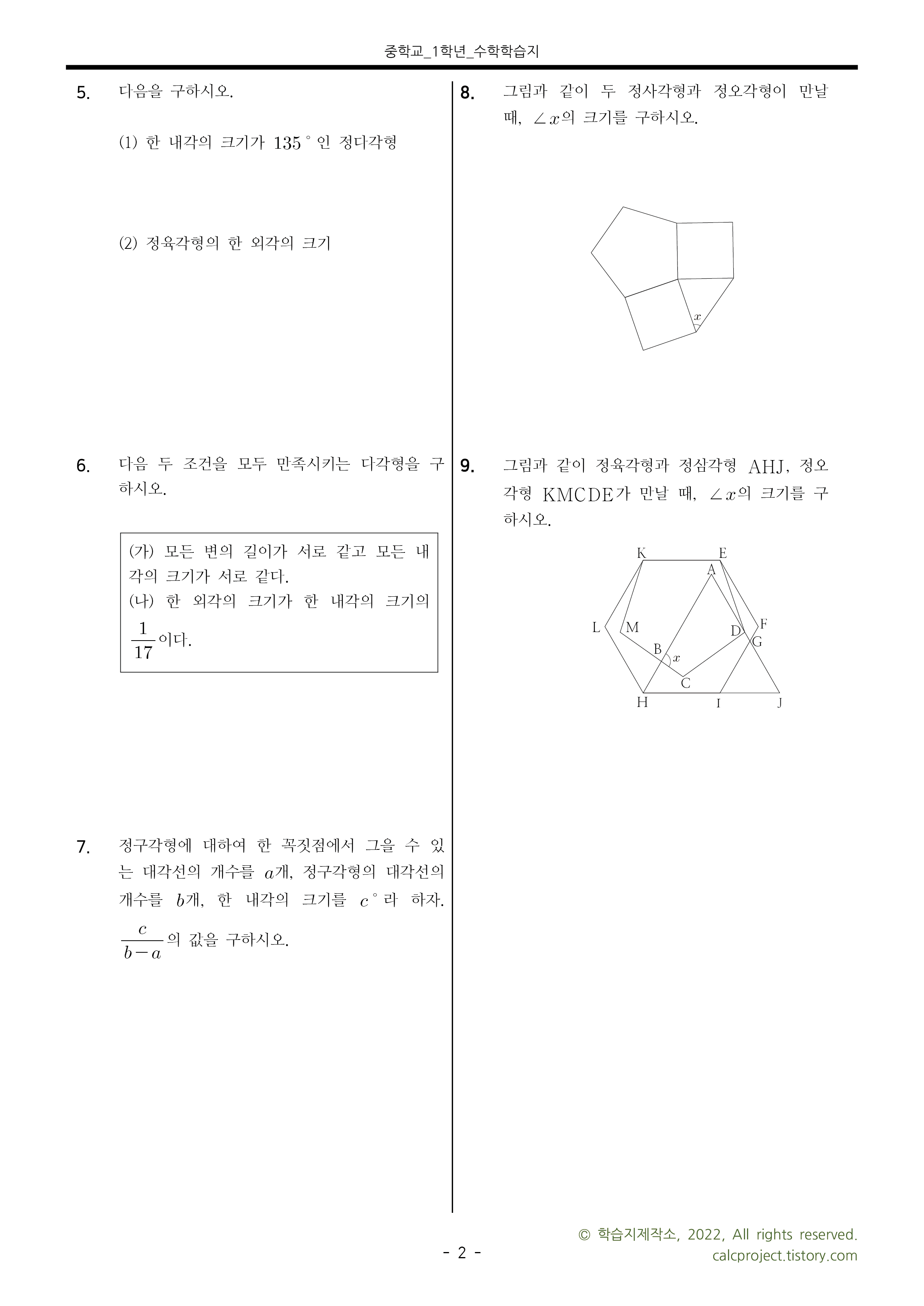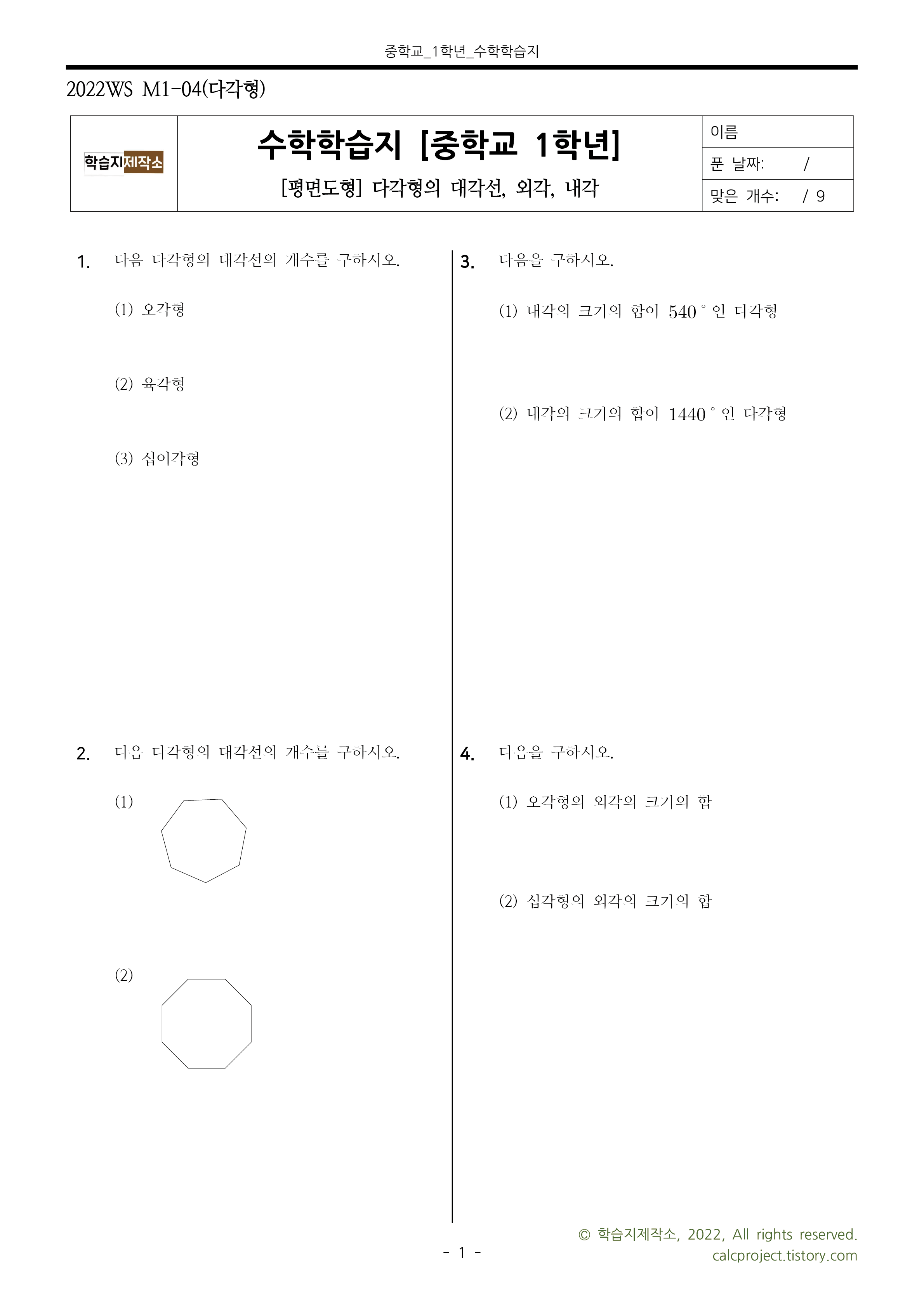 #태그 : 중1, 중학교 1학년, 평면도형, 다각형, 다각형의 조건, 다각형 대각선의 개수, 다각형의 대각선, 다각형의 내각의 합, 정다각형의 내각의 크기, 정다각형의 외각