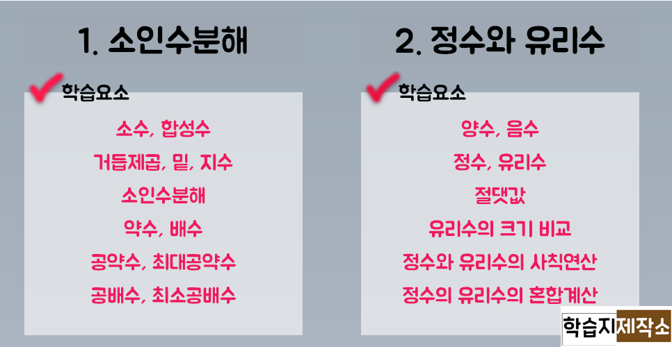 #태그 : 중학교 1학년 수학, 중1 수학, 중1 수학 목차, 중학교 1학년 목차, 소인수분해, 정수와 유리수, 문자와 식, 좌표평면과 그래프, 중1 수학 연산 문제, 중1 수학 학습지, 중1 수학 연습문제