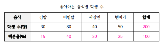 → 햄버거를 좋아하는 학생은 $50 \times \cfrac{100}{200} = 25$%입니다.