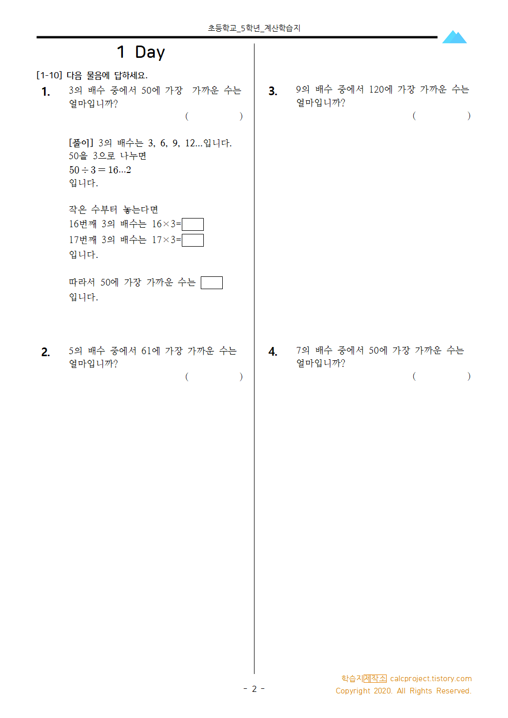 이번 학습지는 어떤 수와 가장 가까운 배수를 구하는 유형을 담았습니다. 배수의 개념을 적용하는 유형이다보니 20문항으로 학습지를 구성하였습니다. 배수의 개념과 비교하기를 차례대로 하면 문제를 풀 수 있습니다.