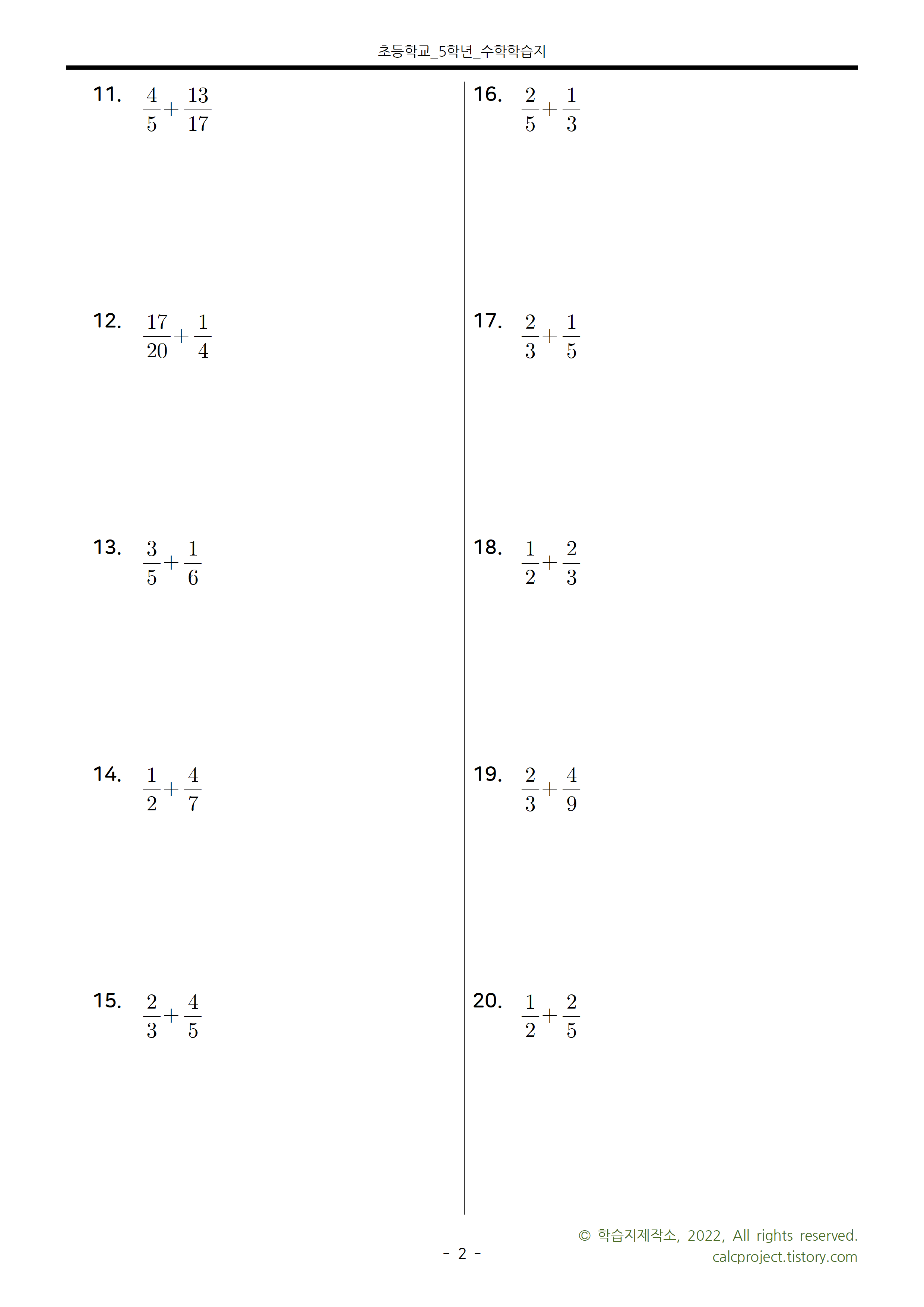 [분수의 덧셈과 뺄셈] 초5 - 분모가 다른 분수의 덧셈 연산연습문제 50제